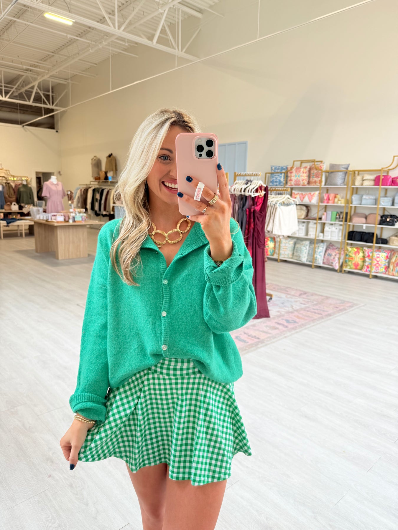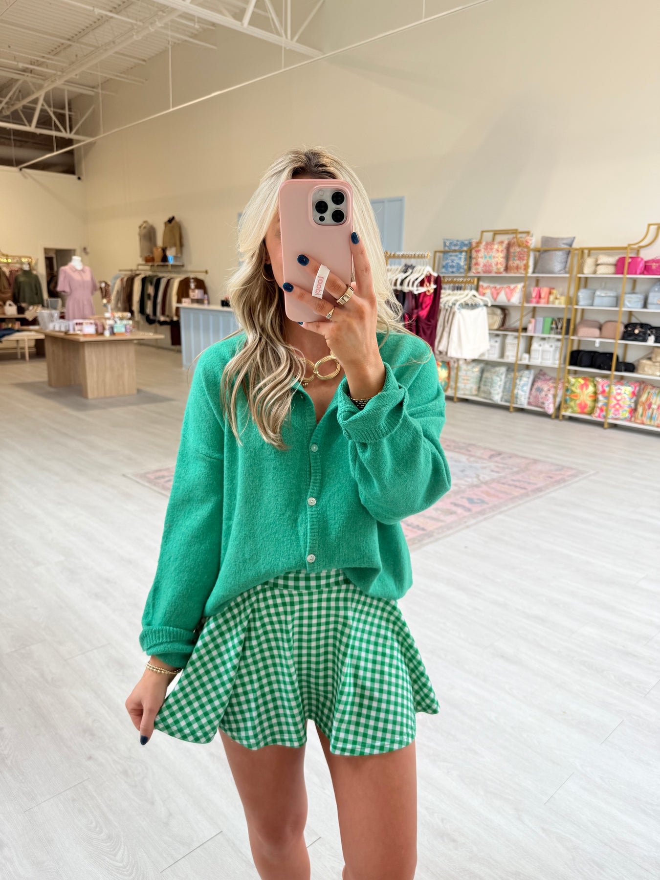 This cardigan already has an oversized fit! We recommend grabbing your true to size. It covers in the back, but also able to be tucked. Jordyn is wearing a small!