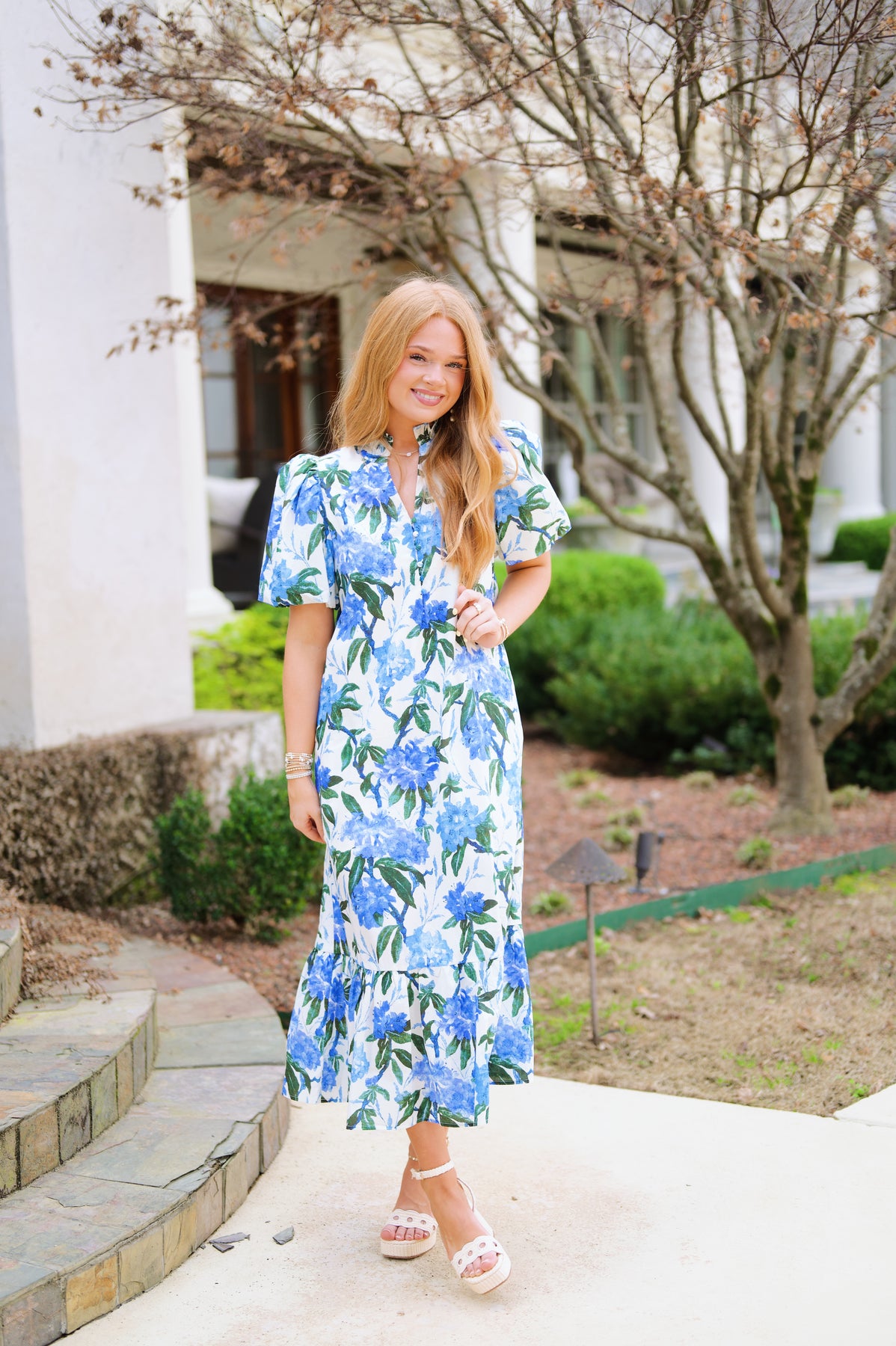 Blue Puff Sleeve Floral Midi Dress