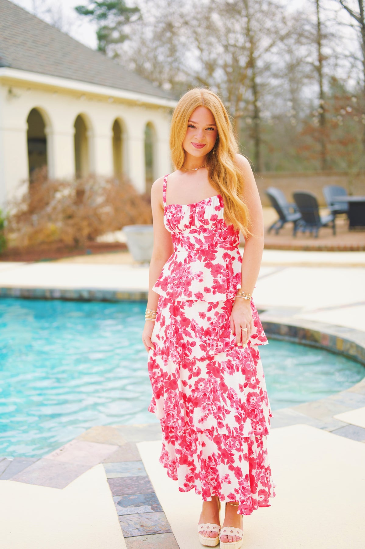 Pink White Floral Tiered Maxi